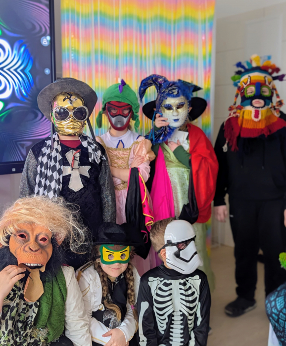 Auch in diesem Jahr wurden von unserem Kollegium wieder einige kreative Stationen vorbereitet. In der Turnhalle durften alle Hexen, Prinzessinnen, Piraten und Zauberer bei einer Kinderdisko ihrem Bewegungsdrang freien Lauf lassen. Es gab die Möglichkeit, bunte Masken zu basteln und sich im Gastaltenraum am Kartoffeldruck zu versuchen. Auf Wunsch wurden die Kinder geschminkt und auch das Erstellen eines eigenen Luftballontieres ließen sich viele unserer Schüler nicht entgehen. Um den Zusammenhalt aller nachhaltig zu stärken, wurden an einer Station zudem diverse Gruppenspiele angeboten, bei denen Teamgeist und Problemlösestrategien gefragt waren.